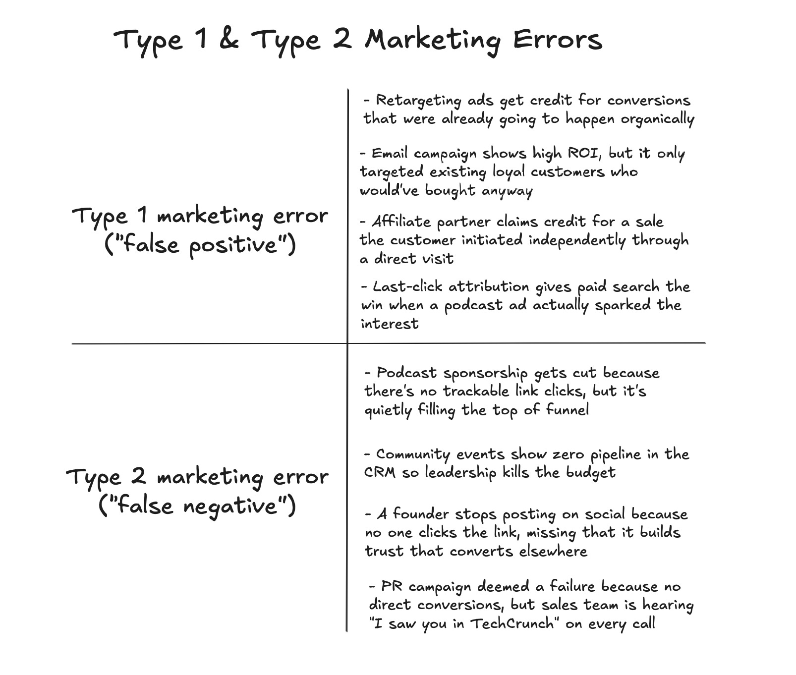 A CMO wants to run a brand campaign, but they know that brand campaigns are notoriously hard to measure. Last year, they ran one, and since they didnât see an immediate uptick in conversions, they felt it was a failure. They also didnât ask anyone at checkout how they heard about the brand. If they had, they would have known that it was word of mouth and out-of-home placements. False negative.