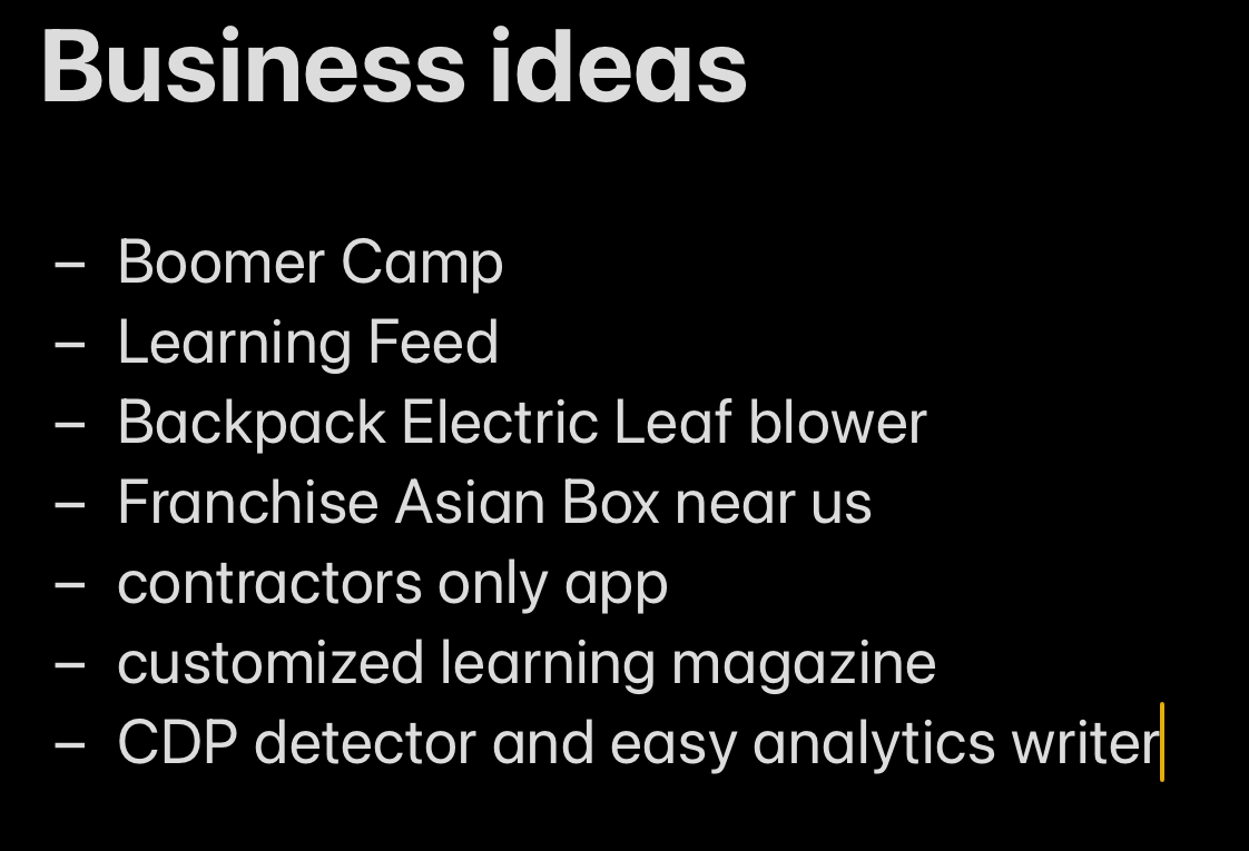 I’m keeping a list of problems that me and friends face, and I’m building small solutions to those problems. In some cases, it might make sense to monetize it. In other cases, those solutions might be deployed as businesses in my consulting work, or sold to companies who would rather pay for a service solution than saas.